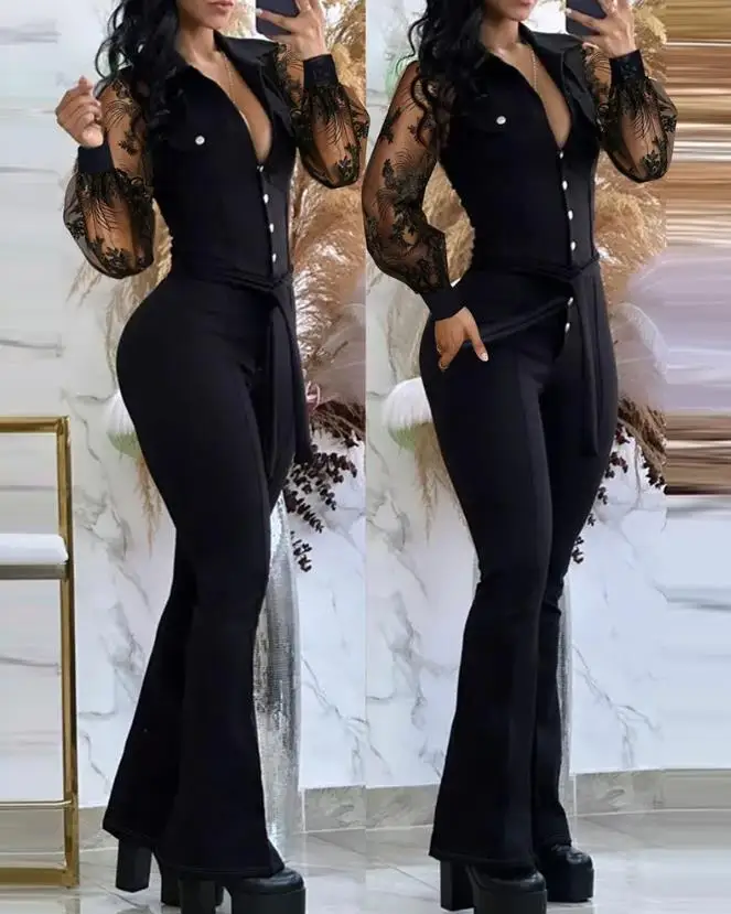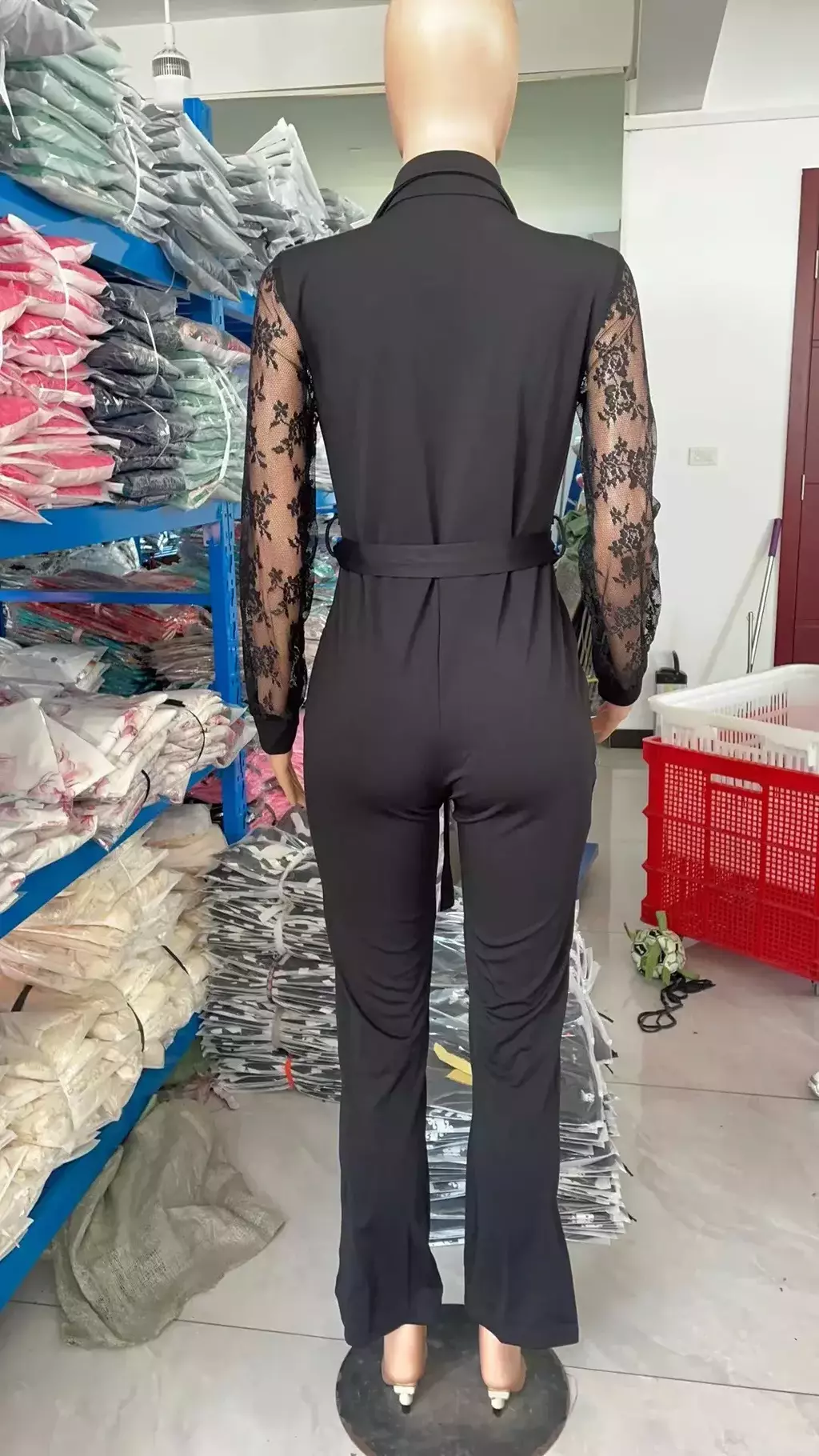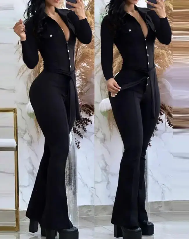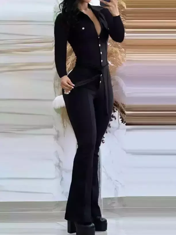 Macacão feminino 2023 primavera moda botão amarrado detalhe turn-down colarinho liso mangas compridas magro diário longo queimado macacão